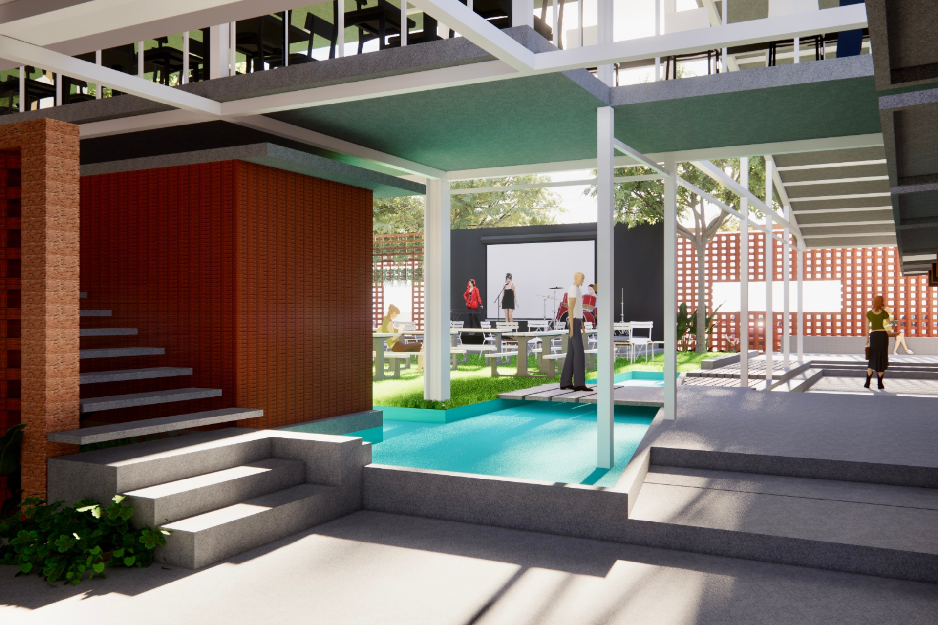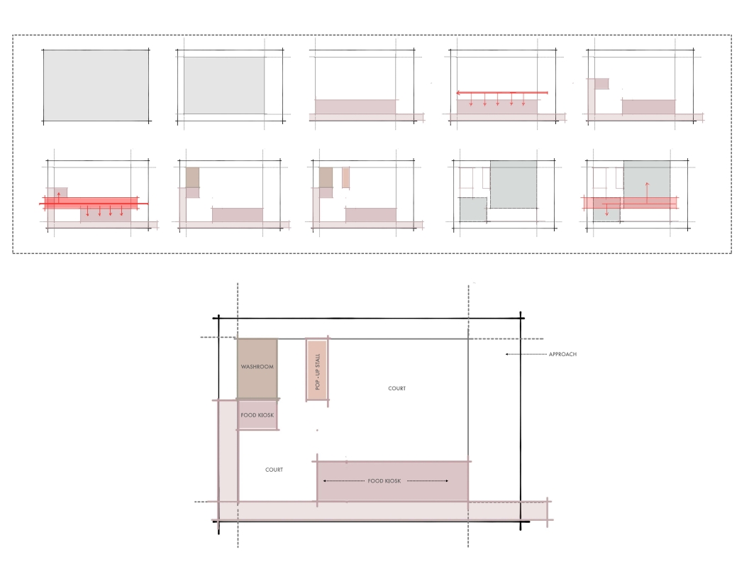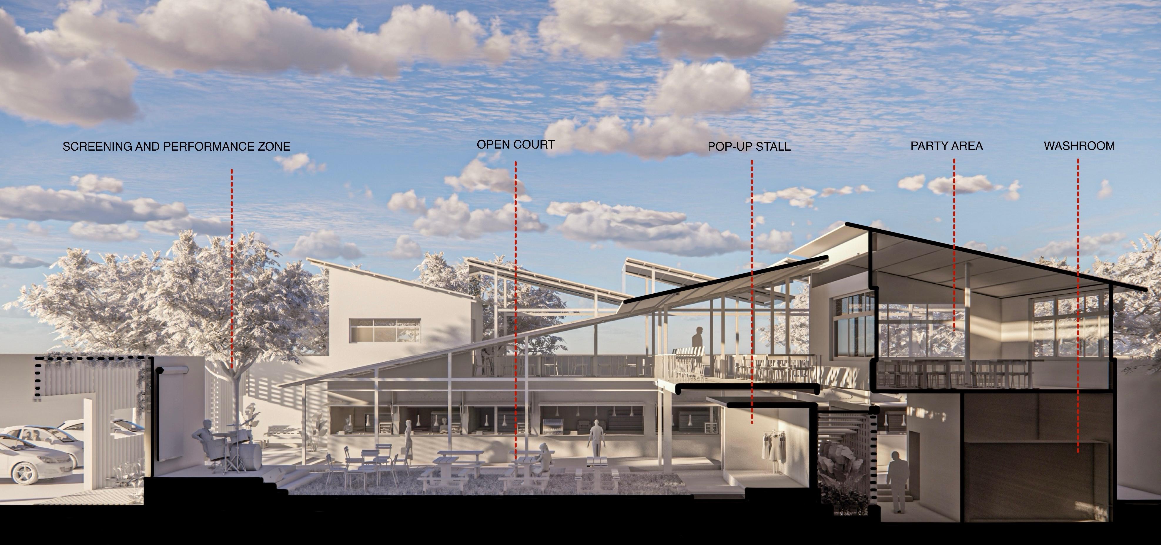The proposed food court in Calicut blends tradition and modernity. The exterior features jali-patterned brickwork, reflecting local heritage, while the interior offers a contemporary, airy space with a light steel structure. This design includes a rented kiosk, a first-floor party hall, visitor washrooms, and an open area for events, creating a versatile community hub.