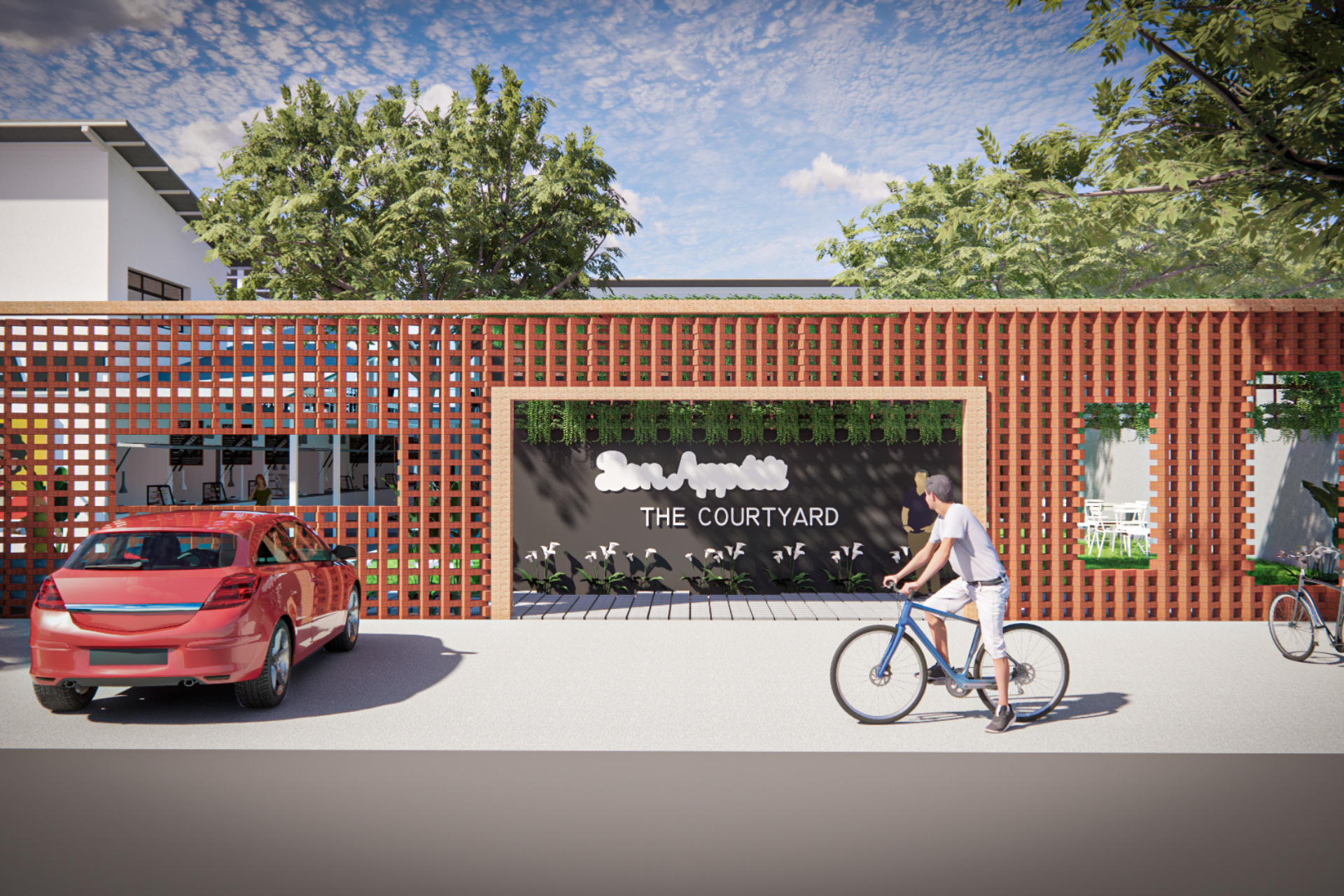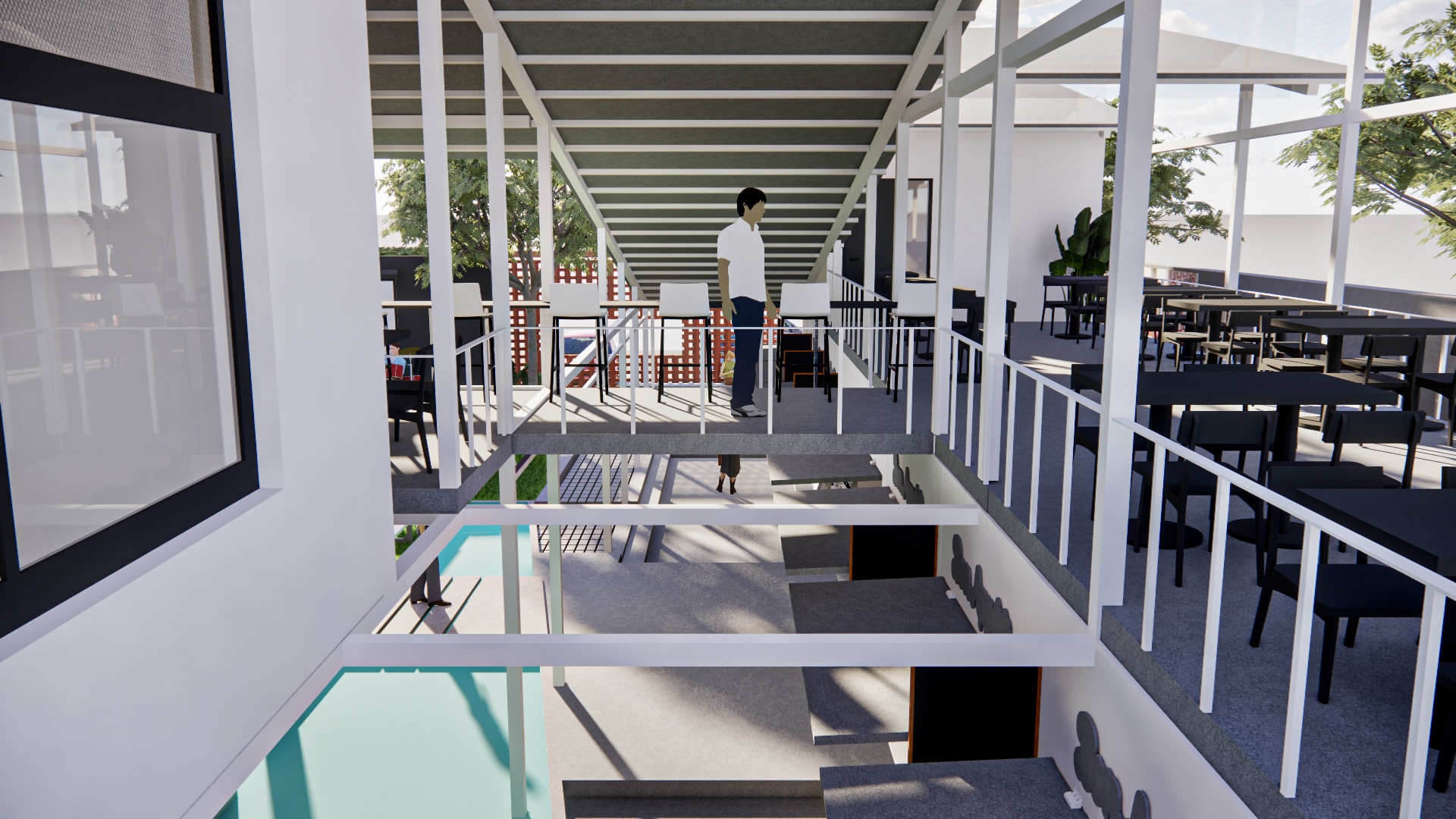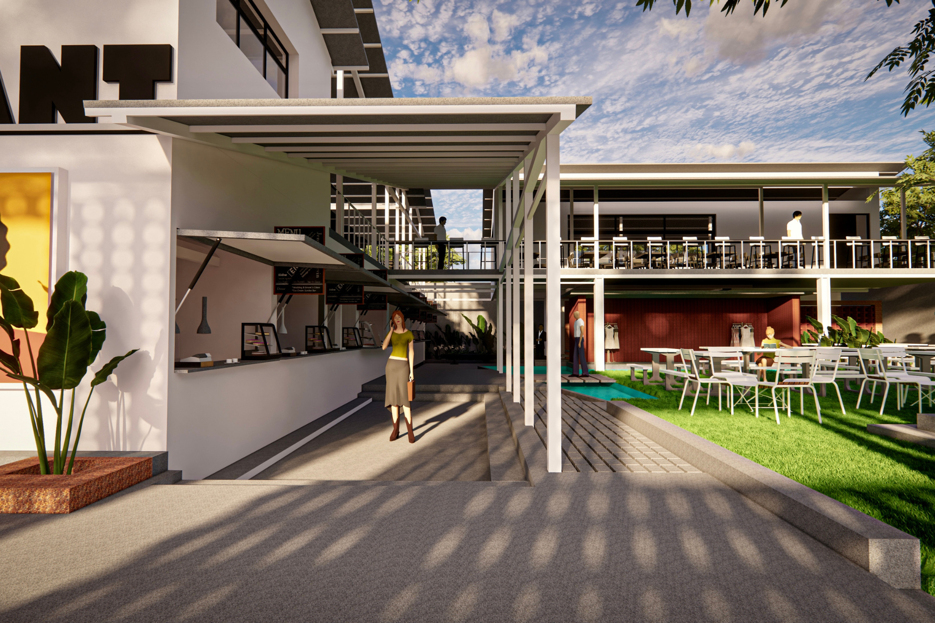 The proposed food court in Calicut blends tradition and modernity. The exterior features jali-patterned brickwork, reflecting local heritage, while the interior offers a contemporary, airy space with a light steel structure. This design includes a rented kiosk, a first-floor party hall, visitor washrooms, and an open area for events, creating a versatile community hub.